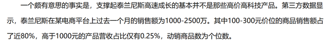 第三方数据显示,泰兰尼斯在某电商平台上过去一个月的销售额为1000-2500万,其中100-300元价位的商品销售额占了近80%,高于1000元的产品营收占比仅有0.25%。