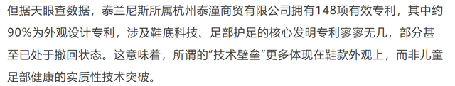但天眼查数据揭示了一个尴尬的现实:泰兰尼斯所属杭州泰潼商贸有限公司拥有148项有效专利,其中约90%为外观设计专利,涉及鞋底科技、足部护足的核心发明专利寥寥无几,部分甚至已处于撤回状态。对此,《新识研究所》点评,所谓的“技术壁垒”更多体现在鞋款外观上,而非儿童足部健康的实质性技术突破。