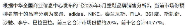 根据中华全国商业信息中心的监测数据,2025年5月童鞋市场前十位品牌包括安踏、adidas、NIKE、泰兰尼斯、FILA、三六一度、斯凯奇、沙驰、李宁、巴拉巴拉,其市场品牌综合占有率合计为44.77%。