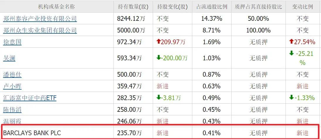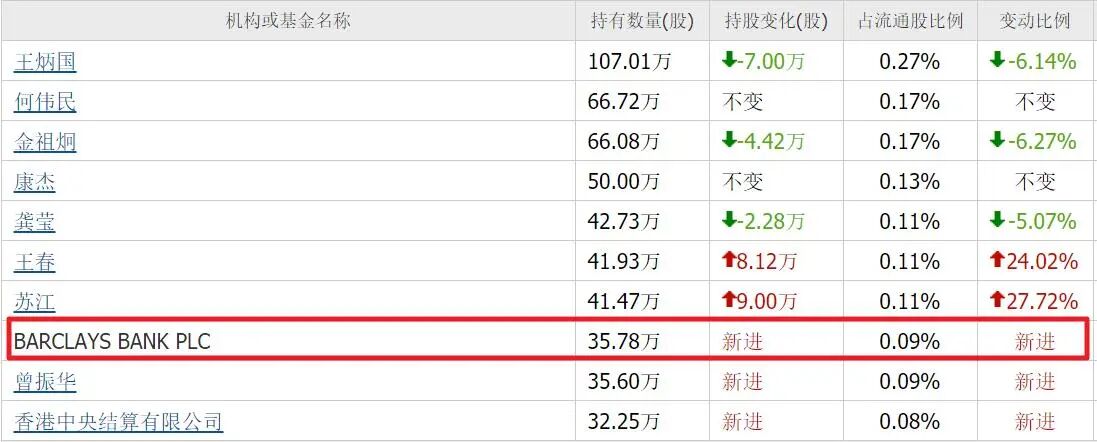 四季度,巴克莱新进35万股位列第八大流通股东。