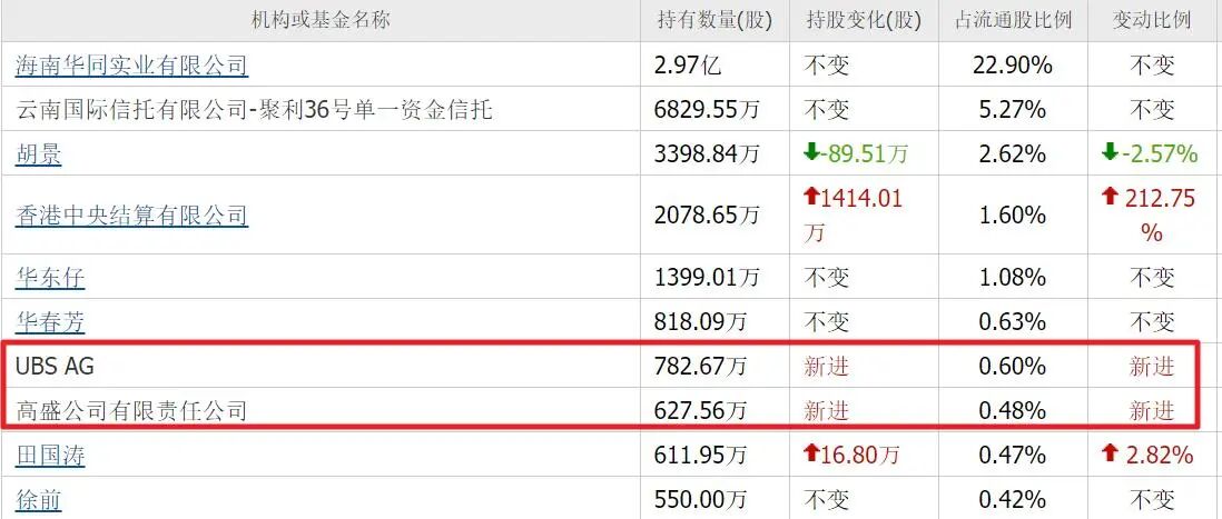 四季度,瑞银新进重仓782万股;高盛新进627万股,分别位列第七和第八大流通股东。