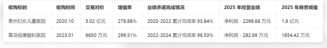 然而,这两笔收购的业绩承诺均未达标,且承诺期一过,两家医院业绩便断崖式下滑,2025年分别亏损2298.68万元和282.69万元,沦为业绩包袱。