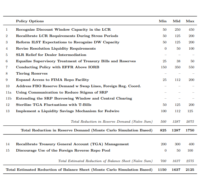 允许有效联邦基金利率(EFFR)高于IORB,即打破当前EFFR长期低于IORB的状态。论文援引Lopez-Salido与Vissing-Jorgensen(2025)框架估算,若以"EFFR-IORB = +2bp"为参考(接近2019年9月压力水平),对应准备金需求下降区间为1500亿至5500亿美元。