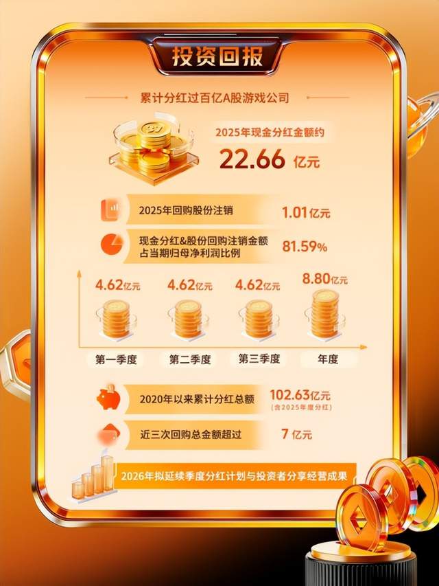 以A股游戏行业头部公司三七互娱(002555.SZ)为例,在实现了2025年归母净利润29亿元的优异成绩后,三七互娱2025年度拟向全体股东每10股派送现金股利含税4元,预计现金分红总额约8.8亿元。而此前三个季度,三七互娱已派发现金股利13.86亿元。2025年全年,三七互娱累计现金分红总额将高达22.66亿元。