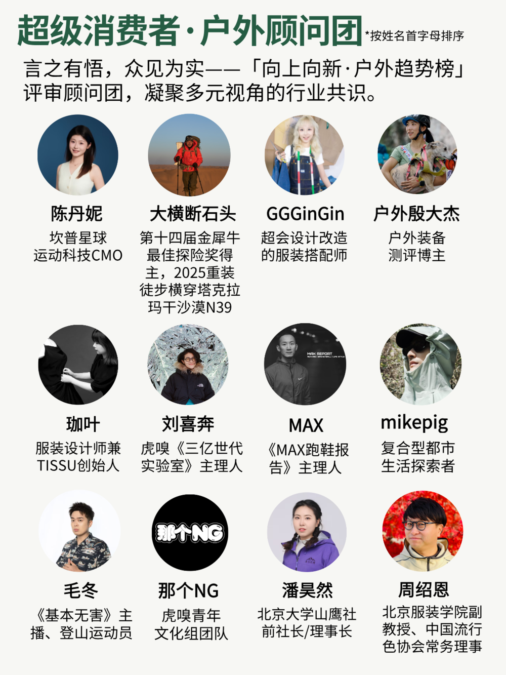 本次榜单的评选,离不开以下12位评委的全程参与。他们来自品牌、探险、设计、测评、学术等多元领域,以专业眼光和真实体验,共同完成了提名、审议与定榜。在此表示诚挚感谢。