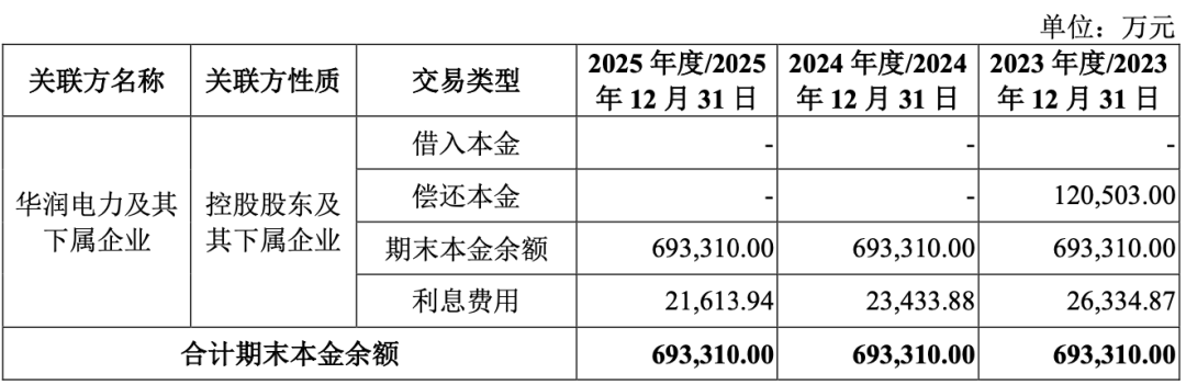 报告期各期末,华润新能源合并资产负债率分别为 54.80%、57.50% 和 59.98%。公司处于资本密集型行业,固定资产投资规模较大,其中债务资金主要来自于银行贷款。截至 2025 年末,华润新能源负债合计 1411.12 亿元,短期借款就达 124.23 亿元。