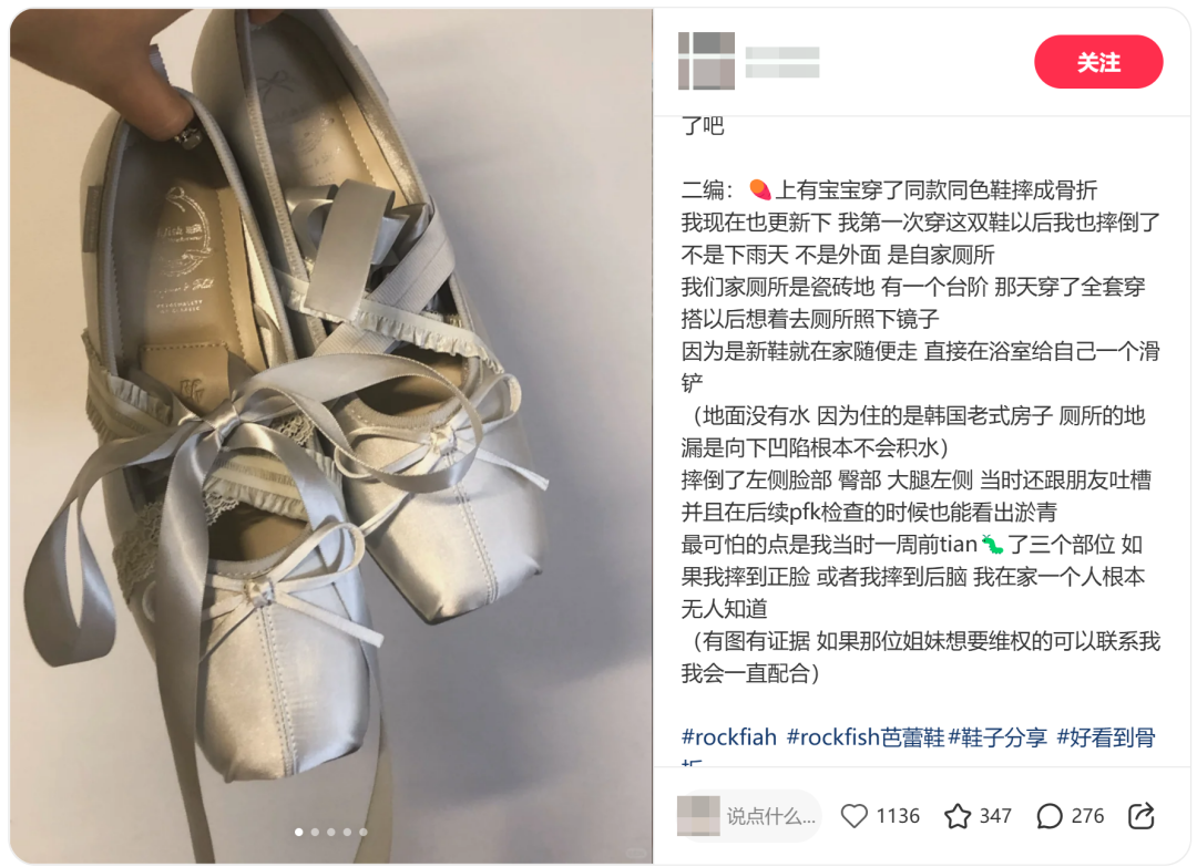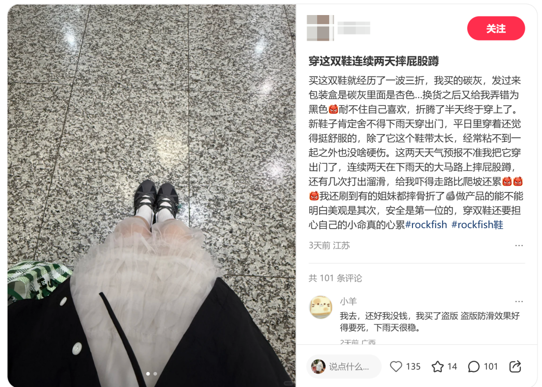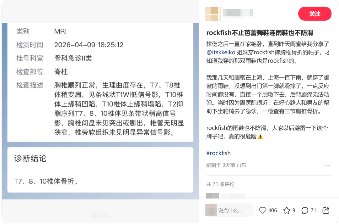 4月17日,有一位消费者在社交平台上分享了自己的惨痛经历,她穿着Rockfish(近几年因为芭蕾风格的鞋出名的品牌),在雨天的路上连续打滑三次,第三次终于没能稳住,直接摔成了胸椎骨折,目前这篇帖子已经被删除。