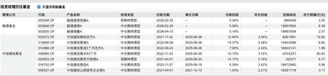 2025年6月,杨龙龙接连卸任6只在管产品,合计管理规模超百亿。其中表现最好的是中信建投景和中短债A,产品规模6.71亿元,2021年4月至2025年6月期间回报率14.17%,年化回报3.19%,回报排名62/371;规模最大的为中信建投稳丰63个月,达80.63亿元。2025年7月,杨龙龙已加入融通基金管理有限公司。