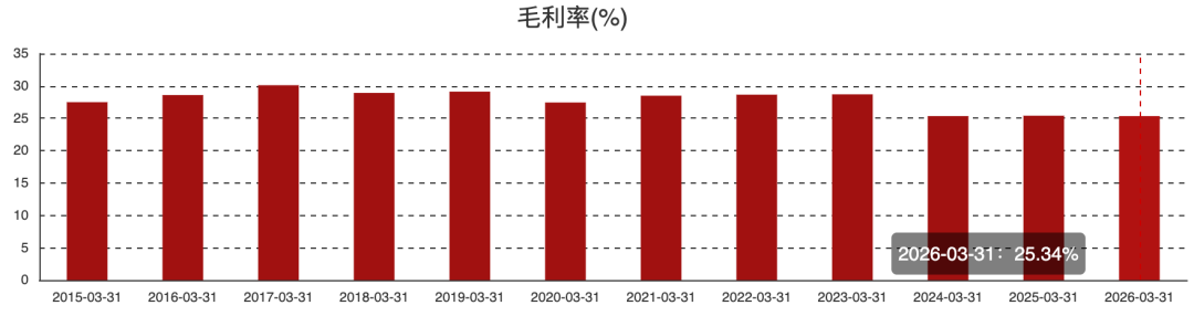 首先是毛利率。一季度海尔智家毛利率25.3%,较2025年同期下降0.1个百分点,较2025年全年的26.7%下降1.4个百分点。