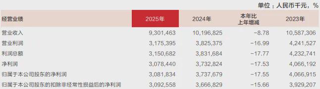 反映到业绩端,2025年东莞银行营收同比下滑8.78%至93.01亿元,罕见跌破百亿关口,自2023年以来遭遇二连降;营业利润、总利润和净利润及归母净利均跌幅17%左右,同样遭遇二连降,比如净利润30.78亿元,同比降幅17.53%。