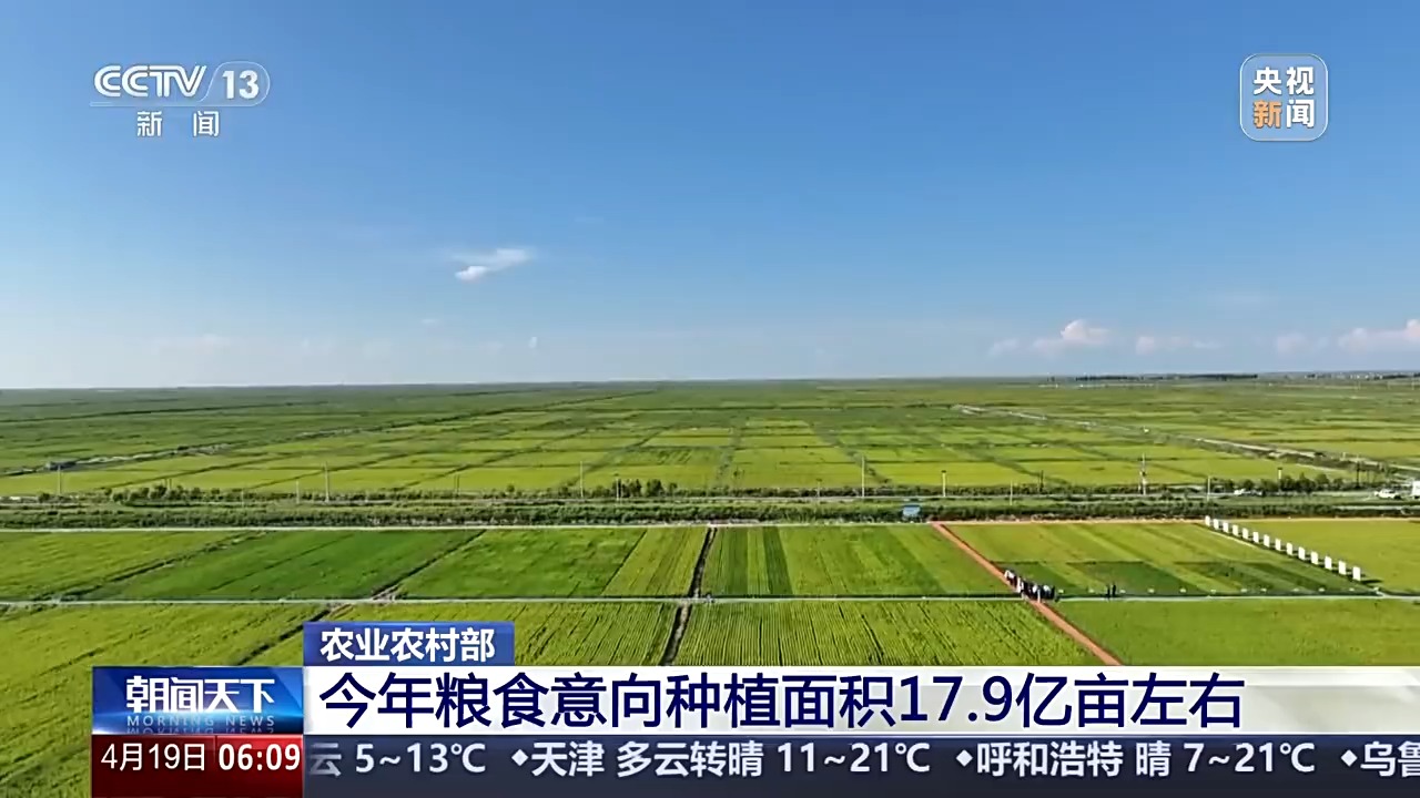农业农村部总农艺师 种植业管理司司长 潘文博:据农情调度,预计今年粮食意向种植面积17.9亿亩左右,其中春播粮食面积9.6亿亩,均比上年有所增加。