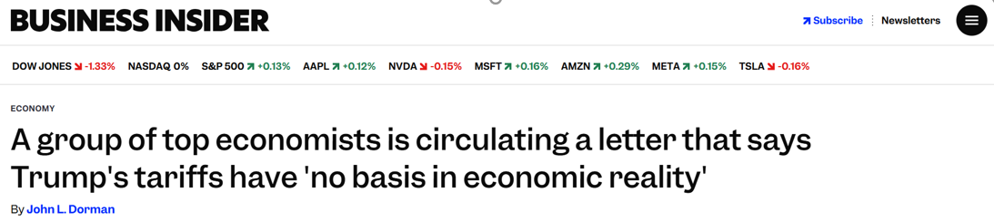 中国日报网4月21日电 据美国“商业内幕”网站(BUSINESS INSIDER)报道,包括两名诺贝尔奖得主在内的数十位美国经济学家签署联名信反对美国政府的关税政策,称其“误入歧途”,并警告这可能引发“自我导致的衰退”。