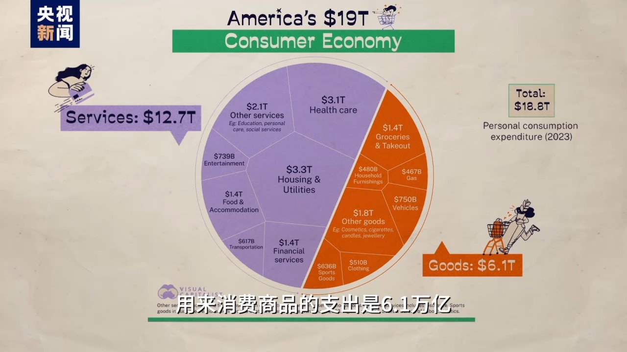 按美国劳动局数据,美国人2023年消费支出18.8万亿美元,其中12.7万亿花在了看病、租房、交学费、打官司等服务上,用来消费商品的支出是6.1万亿,不到总消费的三分之一。所以吹嘘美国消费能力强属实是个“地狱笑话”,看病花钱多有什么可骄傲的?