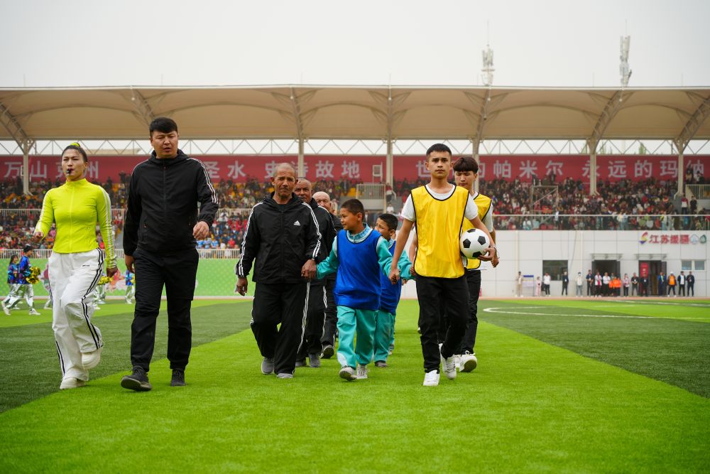 ↑这是在2025新疆克孜勒苏柯尔克孜自治州足球联赛开幕式上,当地老年、青年和儿童群体代表表演节目《三代人足球传承》(4月12日摄)。