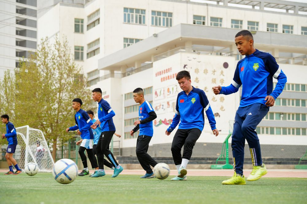 ↑这是在新疆克孜勒苏柯尔克孜自治州阿图什一中,校园足球队的队员们在进行训练(4月12日摄)。