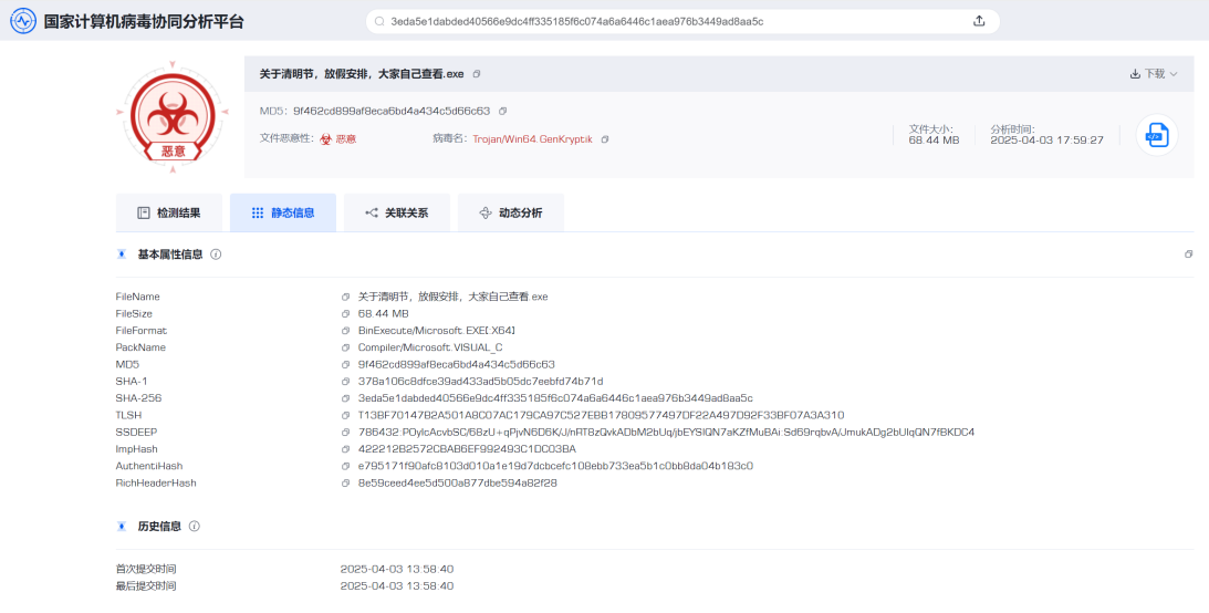 2.针对类似此次传播的系列木马病毒,用户可将压缩包和解压后的可疑文件先行上传至国家计算机病毒协同分析平台(virus.cverc.org.cn)进行安全性检测,并保持防病毒软件实时监控功能开启,将电脑操作系统和防病毒软件更新到最新版本。