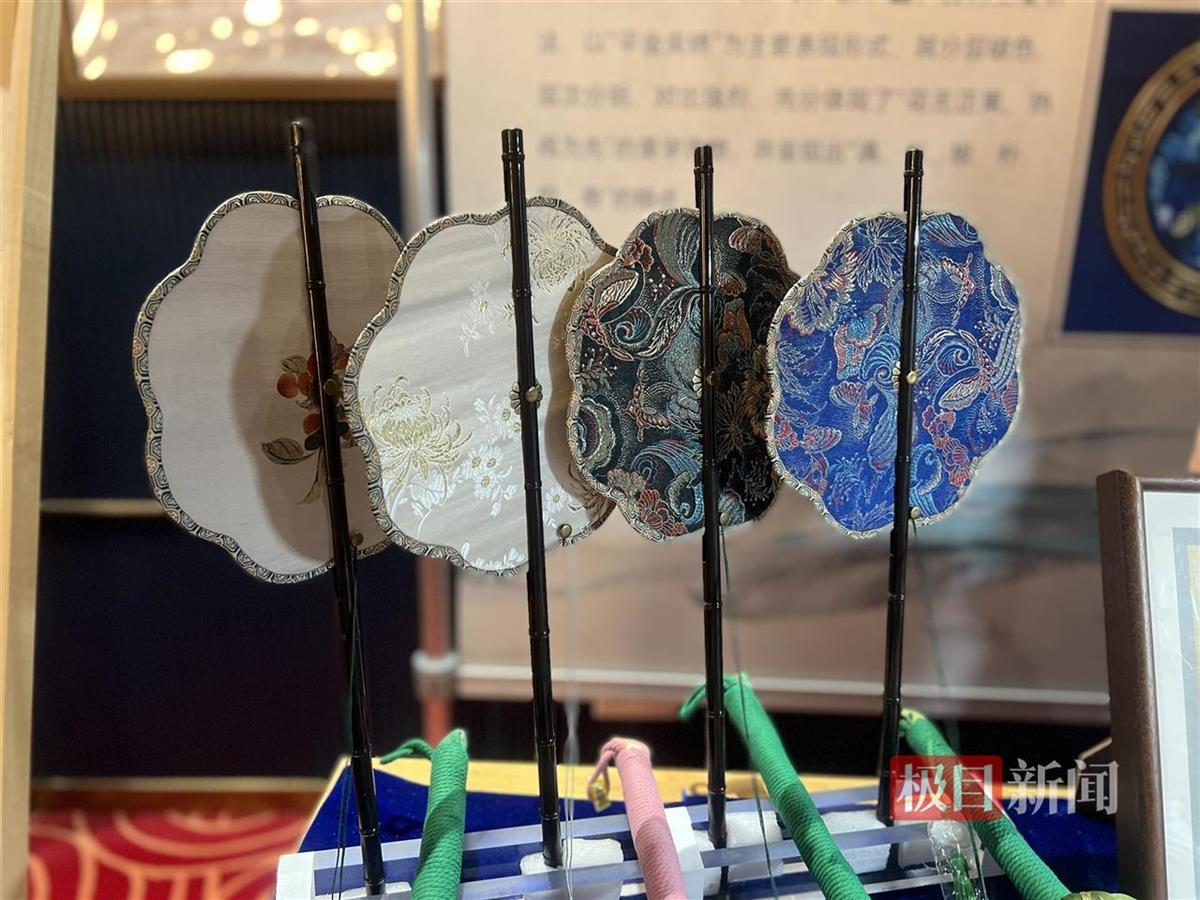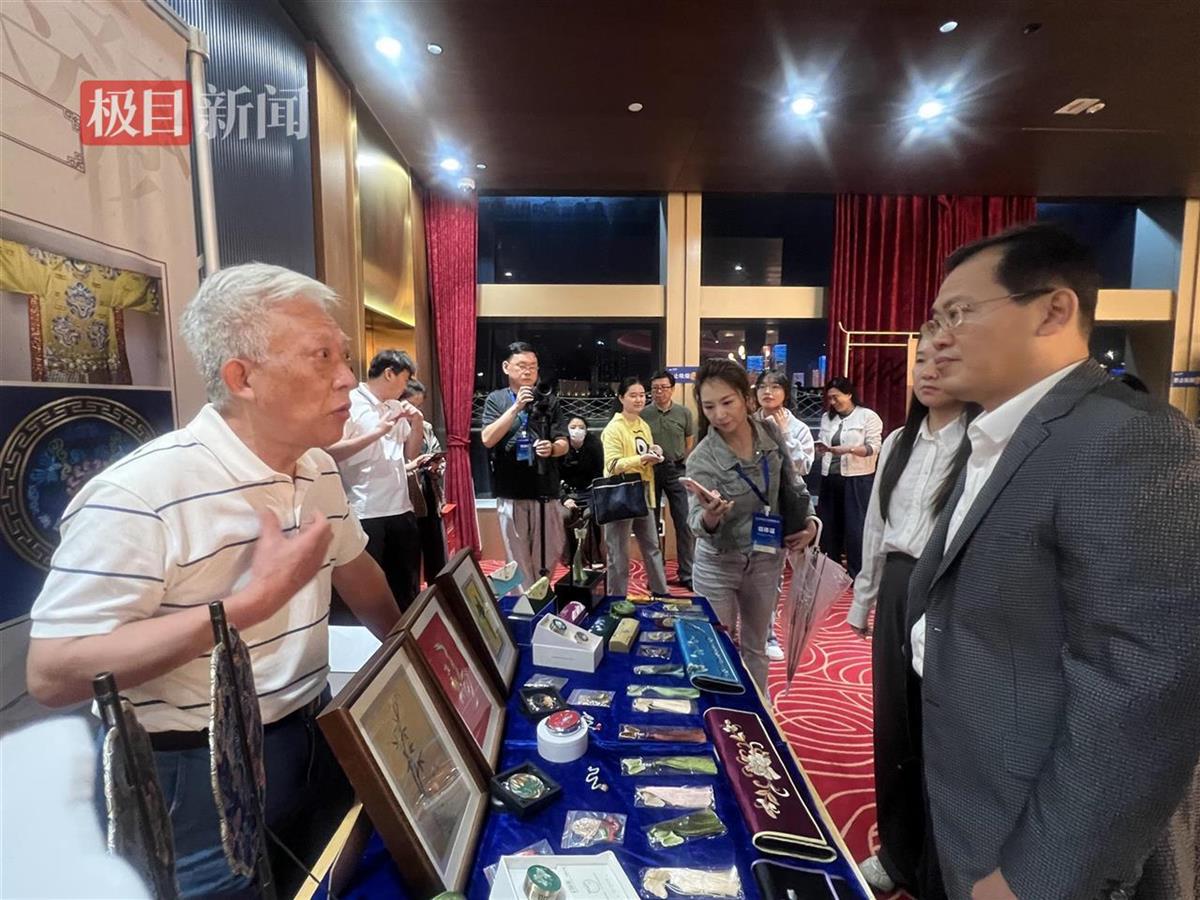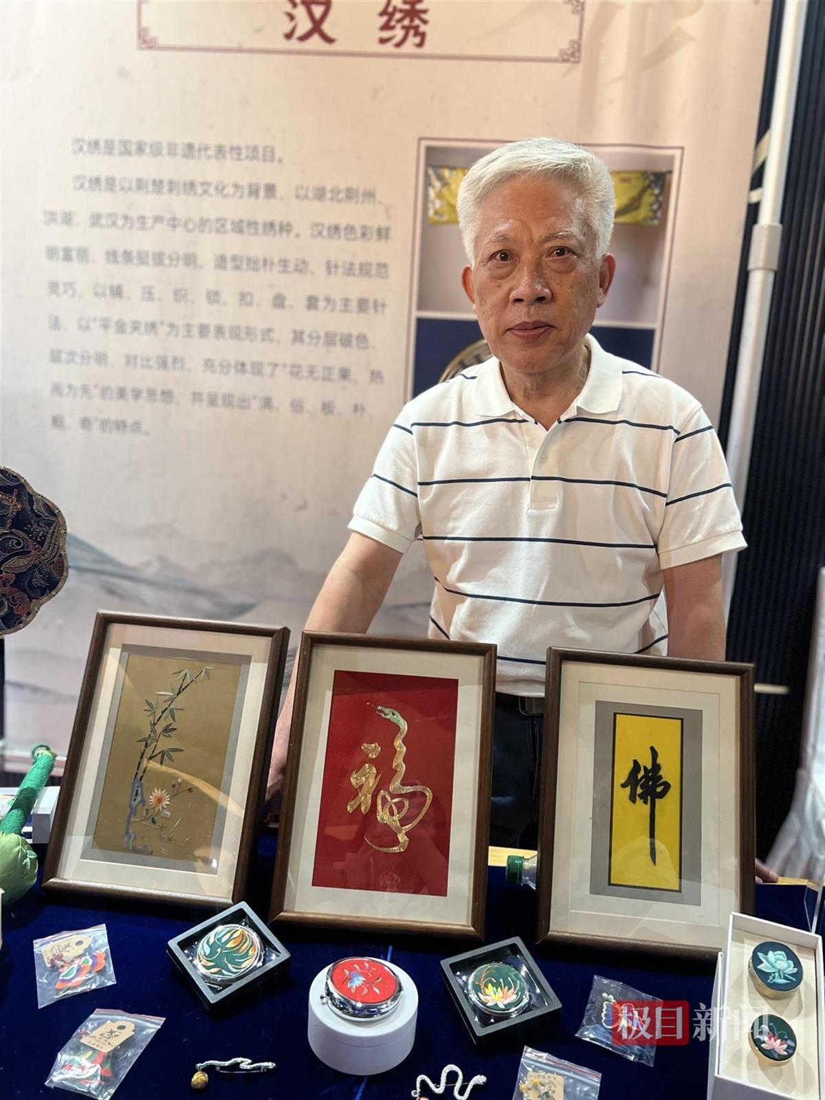 拾级而上,二楼中庭俨然非遗百工坊,汉绣、武汉木雕船模、剪纸、面塑、汉锣等国家级、省级非遗项目一字排开。汉绣展台前,市级传承人姜成国介绍道,“汉绣色彩鲜明富丽,线条挺拔分明,造型拙朴生动,针法规范灵巧,讲究‘花无正果,热闹为先’。您看这江水纹与祥云纹交织,恰似长江汉水的千年对话。”他指着绣品向围观嘉宾解说。武汉剪纸的省级非遗传承人沈松柏则指着自己的作品《黄鹤楼》向嘉宾讲述今年登上央视春晚的幕后故事。