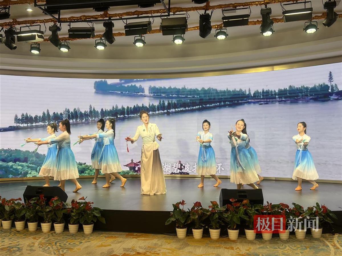 随着汽笛长鸣,游船一楼宴会厅好戏开场,围绕长江文化、知音文化主题,为嘉宾献上了一台兼具荆风楚韵和武汉城市元素的文艺演出。汉剧《贵妃醉酒》以水袖为语,讲述着盛唐遗韵;湖北小曲《欢迎你到武汉来》将本土特色曲种和流行说唱结合,展示了武汉的美景和人文历史,当“来武汉要吃热干面,不吃那就划不来”的歌词响起时,人群爆发出会心笑声。单弦拉戏《戏曲联奏》,表演者仅凭一指一弦,便让《女驸马》《苏三起解》等戏曲唱段在江风中流转,引得现场一阵热烈的掌声,现场嘉宾连连赞叹:“这简直是‘一根弦上的长江文化博物馆’!”