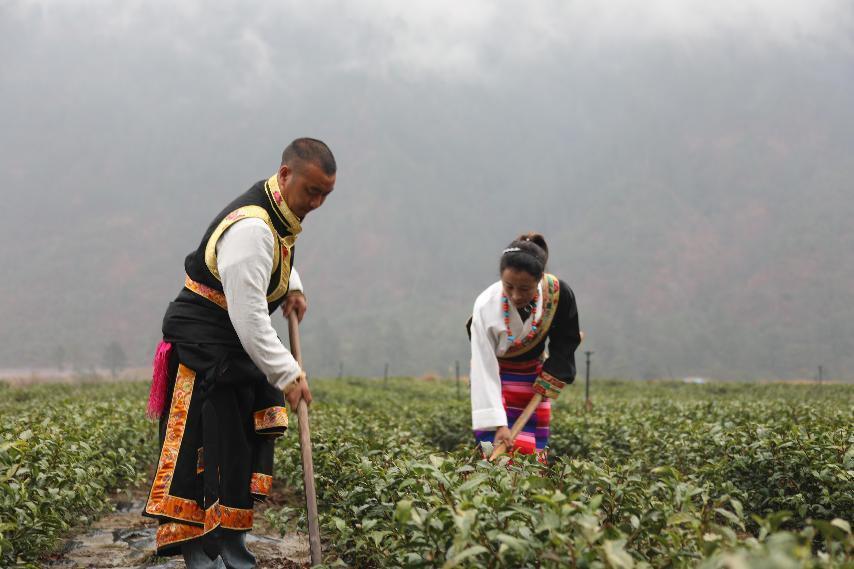 作品简介:拍摄于2022年3月松古村茶园,两位身着藏服的茶农正在茶地里辛勤劳作。