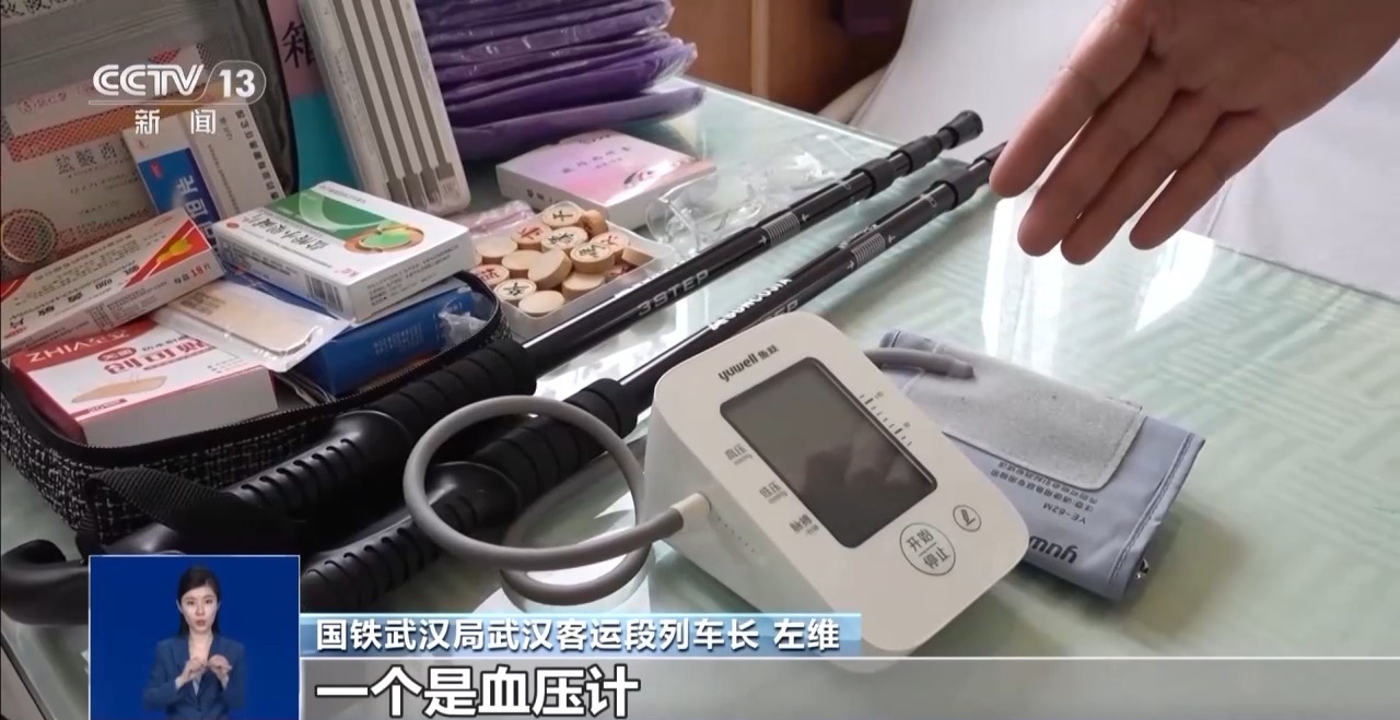 国铁武汉局武汉客运段列车长 左维:我们列车提供了以下这些物品:血压计、老年人经常使用基础药包,在车厢里面还设置了无障碍厕所,早上还提供软食,老年旅客更容易消化吸收。