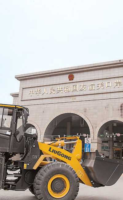 在广西凭祥友谊关口岸,一批装载机驶过口岸出口越南。新华社记者 曹祎铭摄