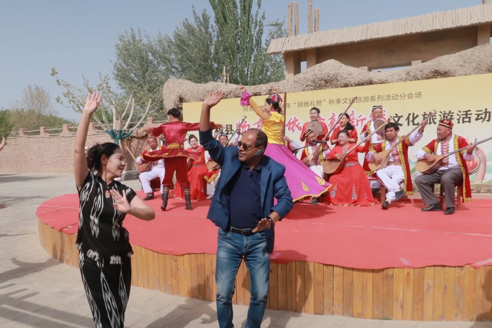 4月26日,外宾在参观阿克苏地区新和县依其艾日克镇加依村时,同表演人员跳舞互动。新华社记者 时艺菲 摄