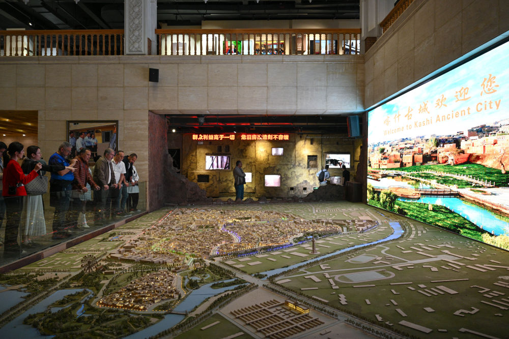 4月25日,来自埃及、伊朗、土耳其等国的外宾在喀什市老城区保护综合治理纪念馆参观。新华社记者 辛悦卫 摄