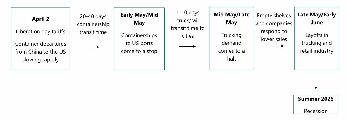同《经济学人》的分析一致,该公司首席经济学家托斯滕·斯洛克明确指出,从关税政策实施到产生明显的衰退迹象,存在大约20至40天的时间差。
