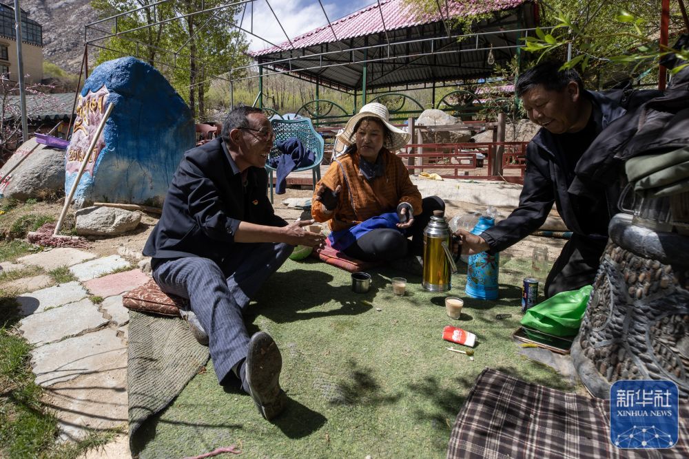 ↑ 尼玛(左)在村里与一家农家乐的经营者交谈(4月24日摄)。