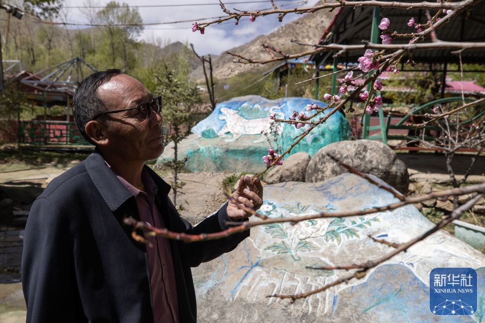 ↑ 尼玛在村里一家农家乐的桃花树前驻足停留(4月24日摄)。