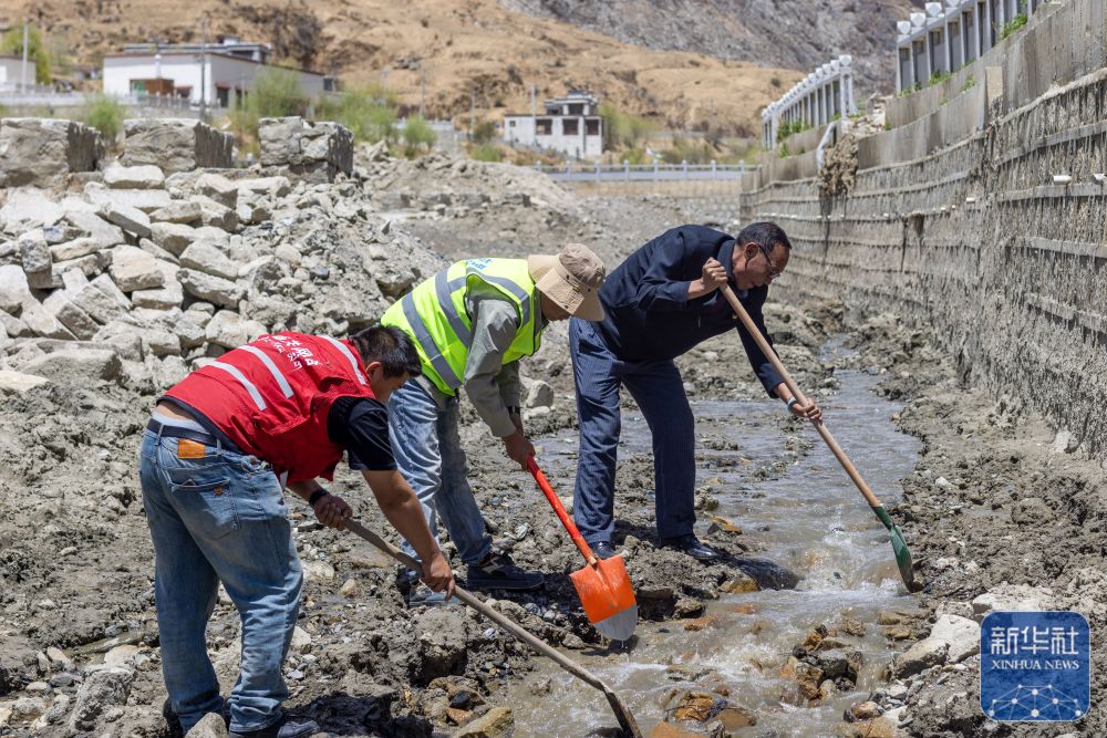 ↑ 尼玛(右)与村民一起疏通村中水道(4月24日摄)。