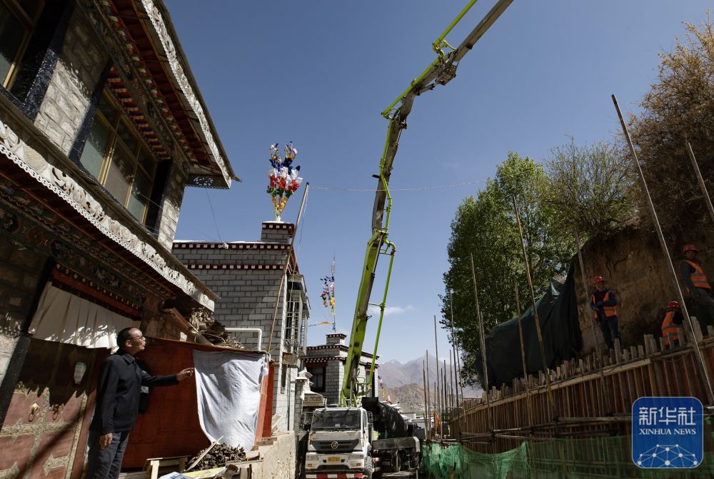 ↑ 尼玛在村里的基础建设提升工程现场指挥工作(4月24日摄)。