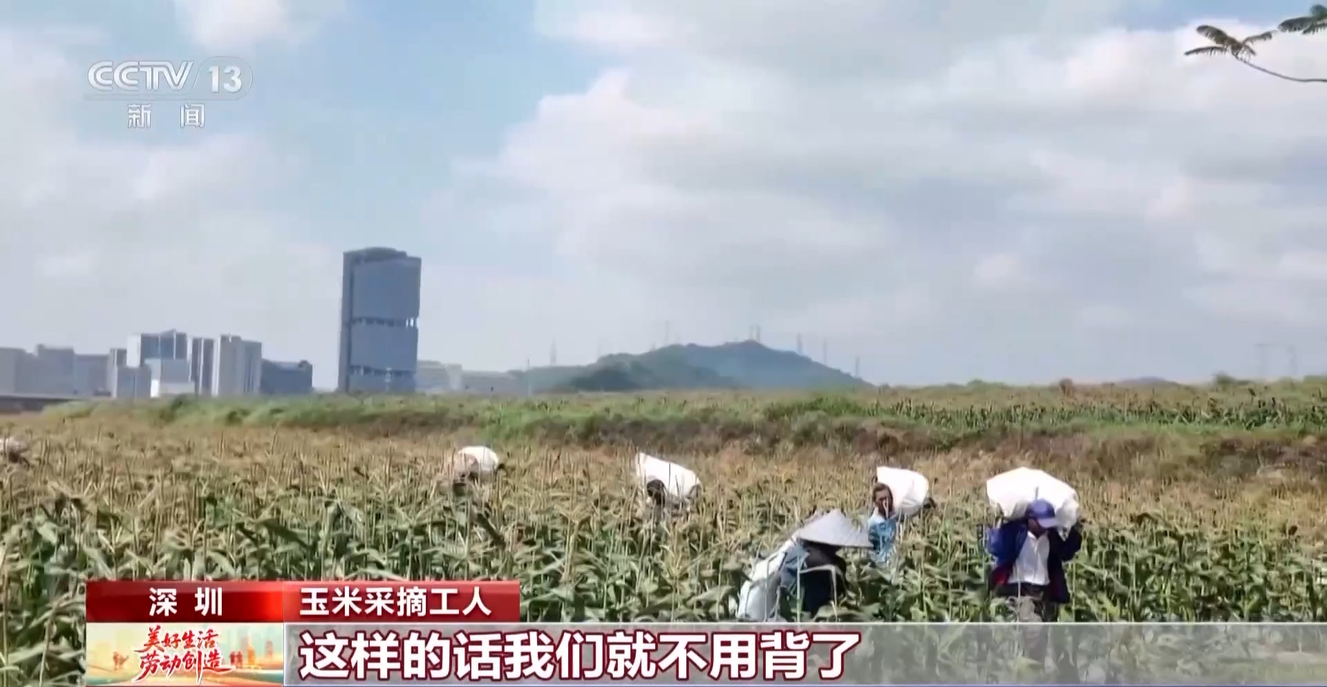 玉米采摘工人:首先体力活没那么重,如果人工背,大概要五六十斤,这样我们就不用背了,采摘就行了。快很多,轻松很多,干得很开心。