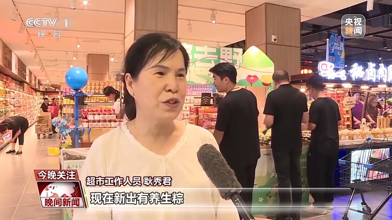 超市工作人员 耿秀君:现在新出有养生粽,低糖低脂,适合老年人吃,玫瑰蜜枣、桂花蜜枣都适合年轻人吃,卖得比较快。
