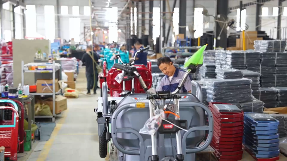 在四川眉山天府新区,记者在双胜新能源车业有限责任公司看到,工人们正紧锣密鼓组装一批即将发往非洲、东南亚的电动三轮车。