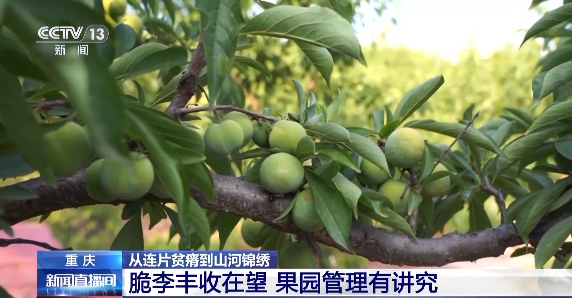 总台记者 伍黎明:在重庆市巫山县双龙镇的天鹅村,这里的平均海拔在400米左右,是巫山脆李最早成熟的区域之一。今年,巫山县将脆李开园的日子定在了7月2日,距离现在还有半个月的时间,这里的脆李个头已经不小了。