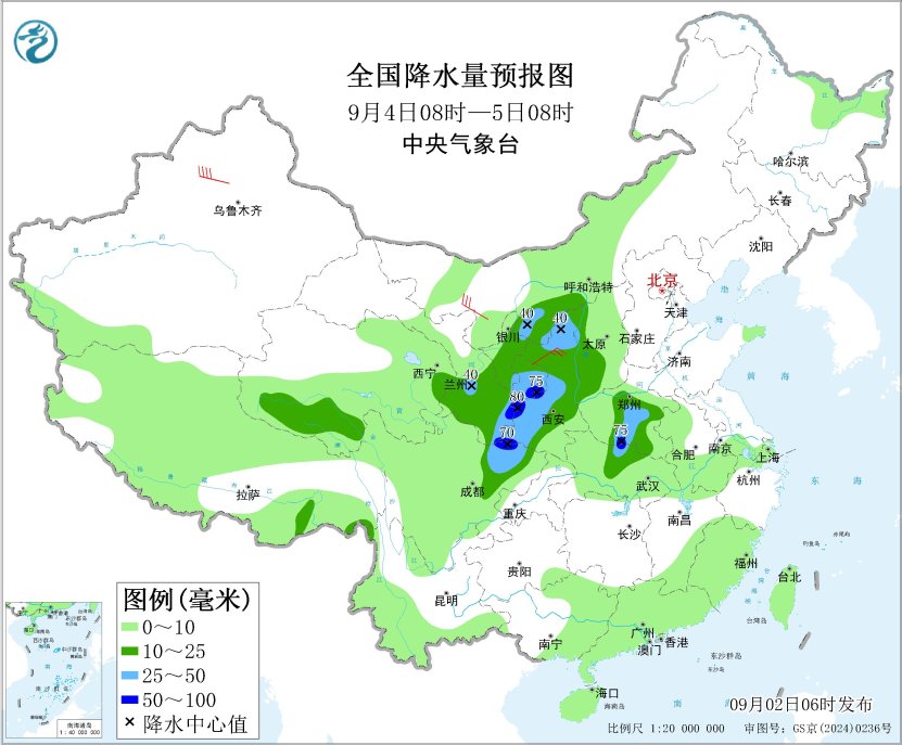 9月4日08时至5日08时,青海南部和东部、甘肃南部、宁夏、内蒙古南部、陕西、山西西部、四川东北部、河南中南部、湖北北部等地部分地区有中到大雨,其中,甘肃东南部、陕西西南部、四川东北部、河南南部、湖北北部等地部分地区有暴雨(50~80毫米)。新疆北部、内蒙古中西部、陕西北部等地部分地区有5~7级风。
