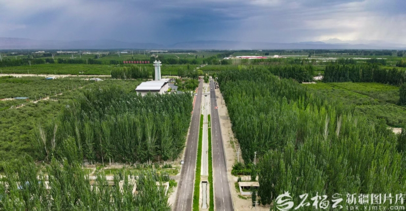 2023年拍摄到的柯柯牙荒漠绿化工程,道路左侧建筑为柯柯牙纪念馆。杨硕摄