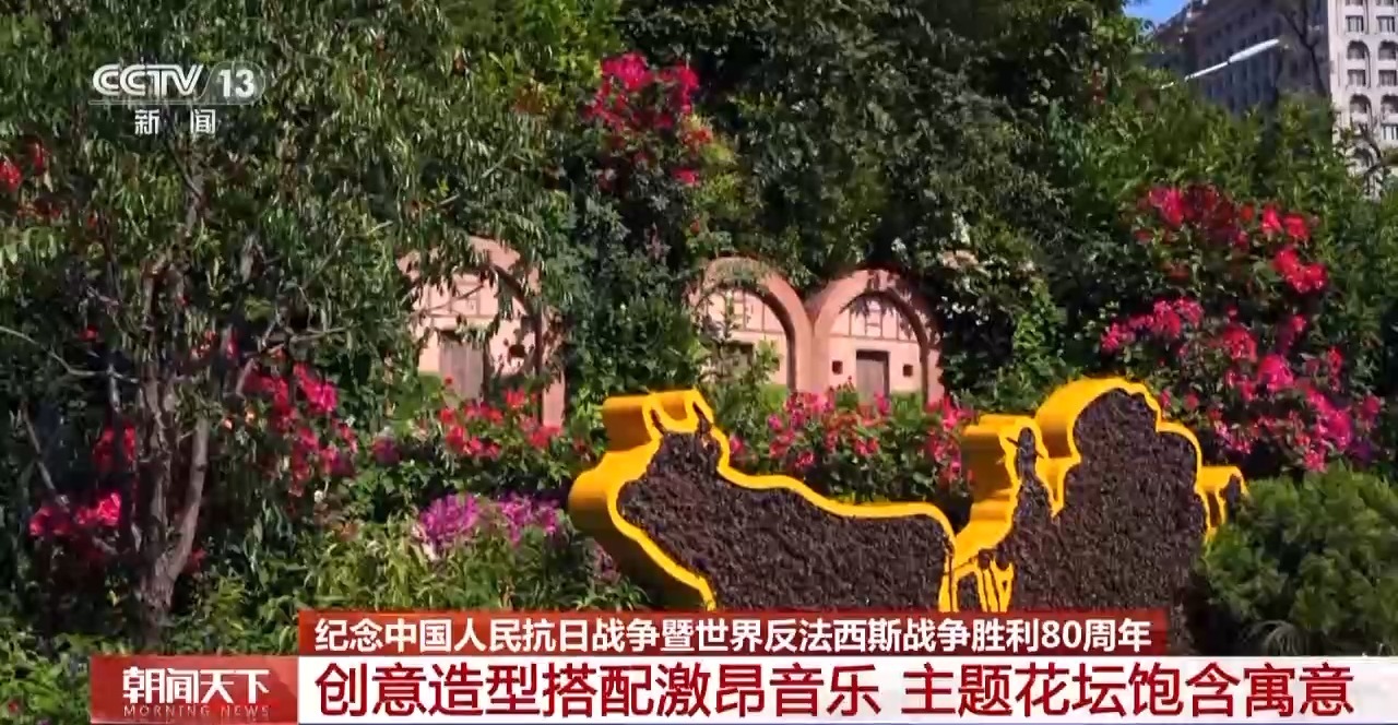 此外,西北角的“薪火相传”主题花坛融汇了火炬、飘带和向日葵等意象,寓意伟大的抗战精神薪火相传、历久弥新。
