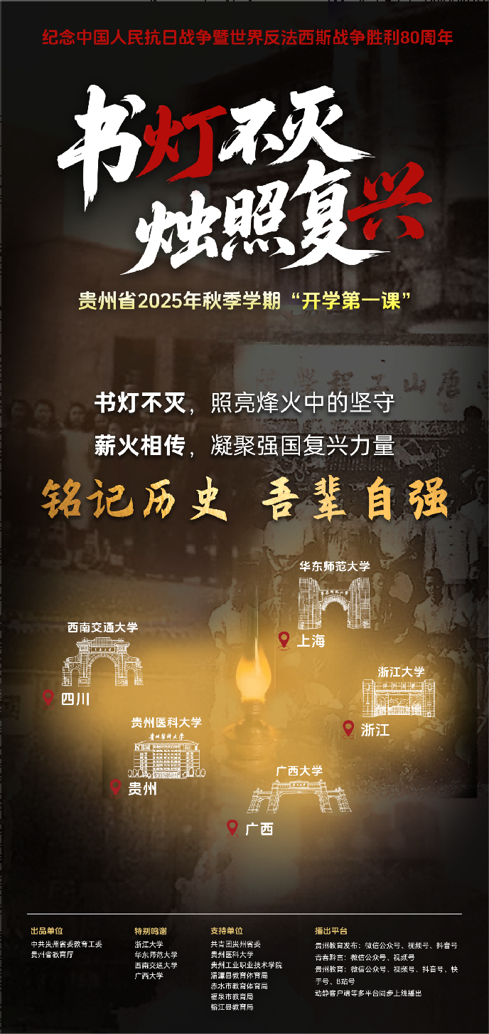 昨晚(8月31日),中共贵州省委教育工委、贵州省教育厅联合五所高校打造的“开学第一课”《书灯不灭 烛照复兴》上线播出。节目以抗战时期高校西迁贵州办学的历史为主线,通过珍贵影像、AI复原场景和深情讲述,再现了战火中师生坚守教育使命、贵州人民与内迁高校共克时艰的感人历程。全省各地中小学积极响应,组织师生收看节目,并结合本地实际开展形式多样的抗战精神主题教育,让开学第一课成为铭记历史、传承精神、启迪未来的重要载体。