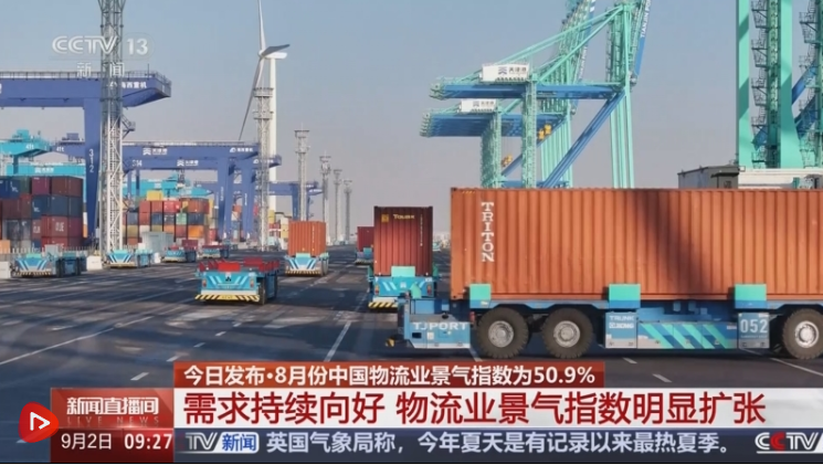 央视网消息:中国物流与采购联合会9月2日发布8月份中国物流业景气指数。随着促消费、稳投资、保民生等各项政策落实显效,供应链、产业链加速联动,需求持续向好,物流业景气指数扩张明显。