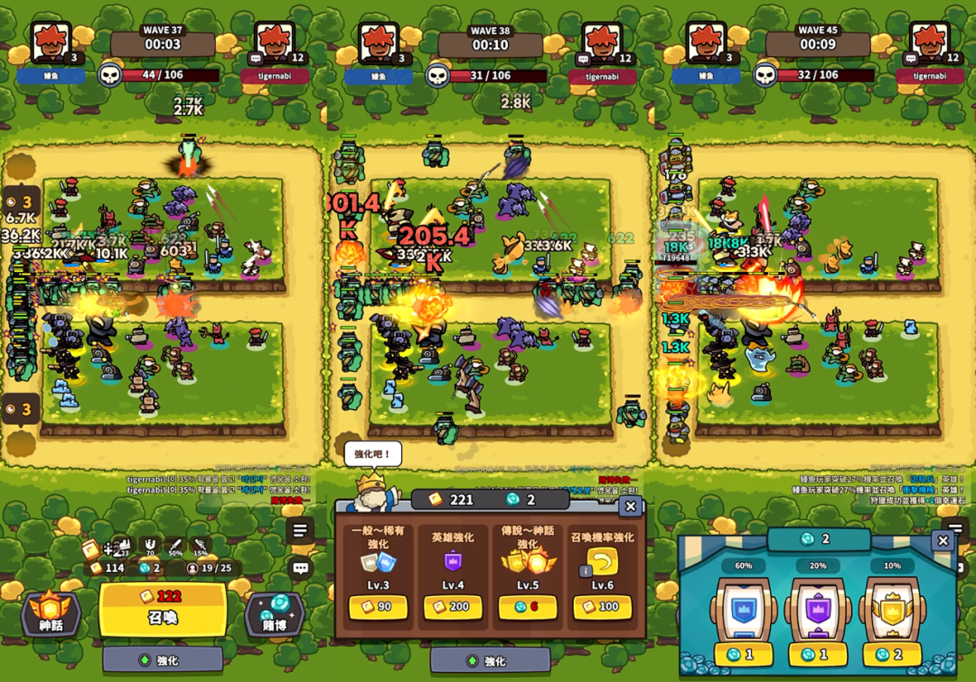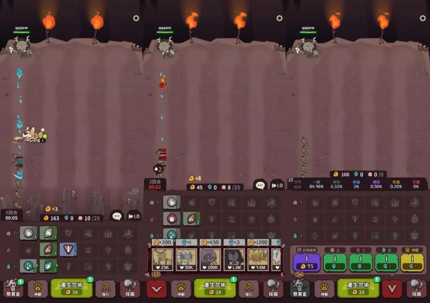 随着怪物被消灭,玩家能够获得对应货币,这些货币除了可以再次随机召唤英雄外,还可以用来强化(英雄属性提升或召唤概率等)、或者用来召唤高品质英雄(蓝、紫、金,有概率一无所获)。值得一说的是,神话级英雄无法三合一获得,只能通过神话召唤特定的多名英雄进行合成。