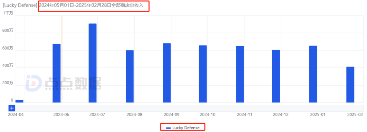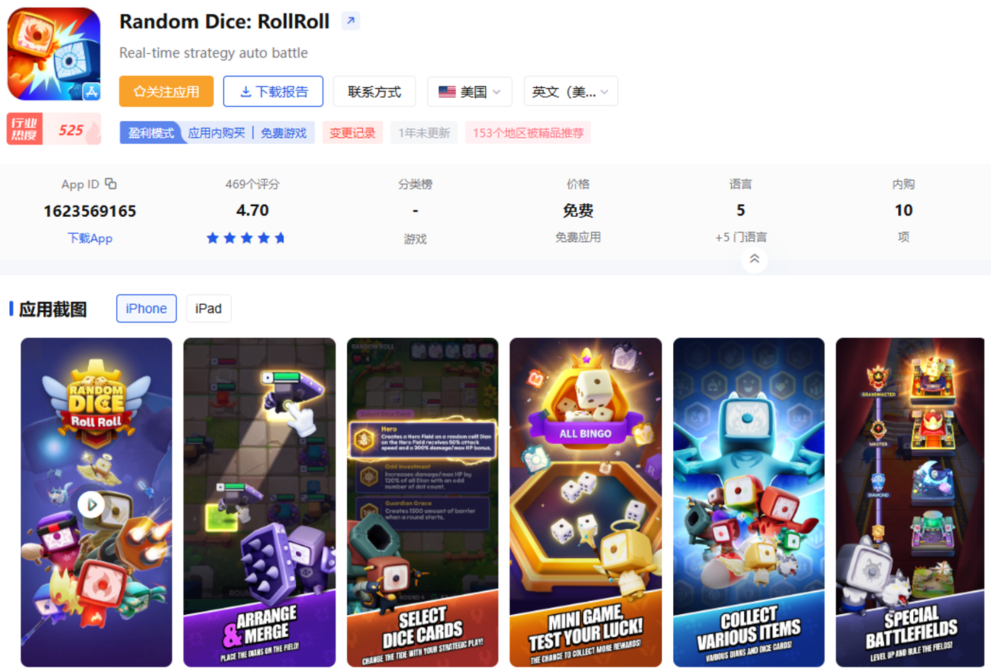 《Random Dice: Defense》上线不久便拿下了单月流水过亿的成绩,并在韩国iOS游戏畅销榜TOP10待了两个月之久,直到2022年10月(9734万元)其月流水才下千万,目前其月流水预估在200万左右,月下载量不到10万。