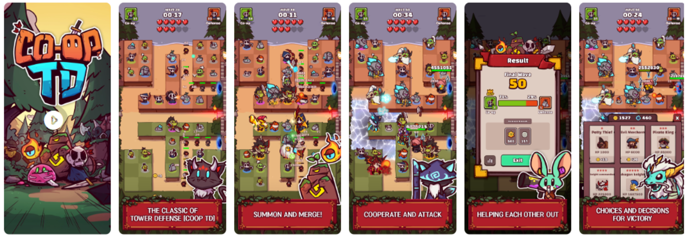 该作在美术表现方面更加精致,走Q版趣味风,底层框架依然是111%擅长的“塔防+合成”,玩家需要联机匹配或邀请好友一起完成关卡挑战,对局界面与《Random Dice: Defense》几乎一致,只是上方为队友的区域,下方为玩家区域。