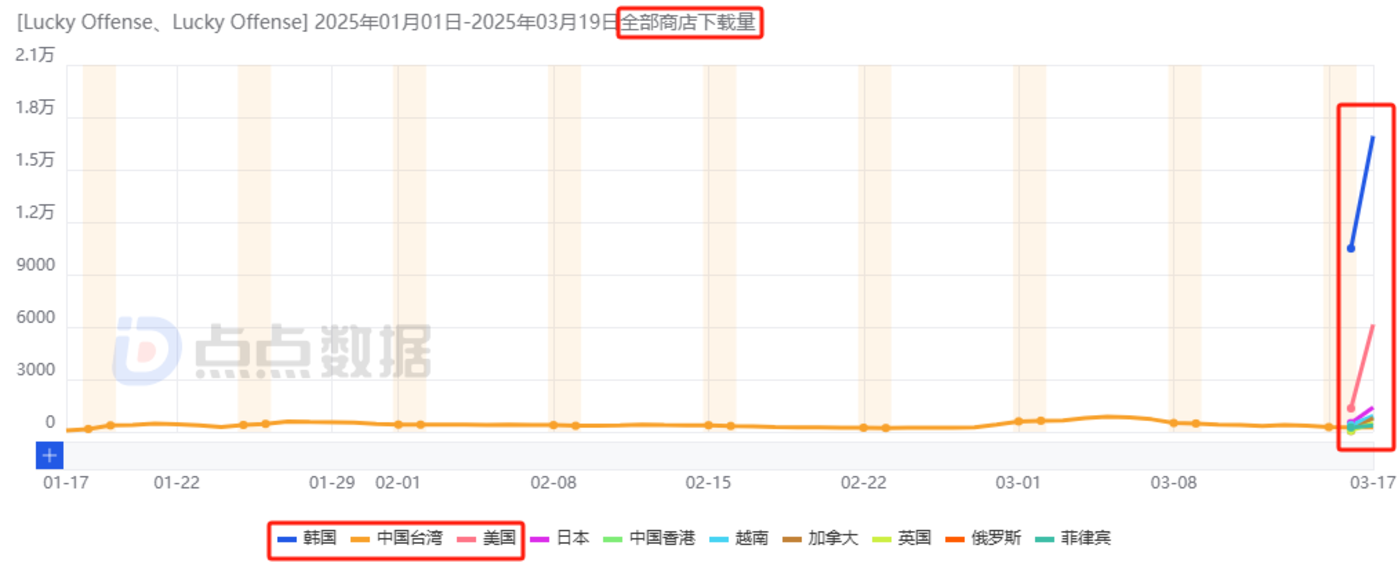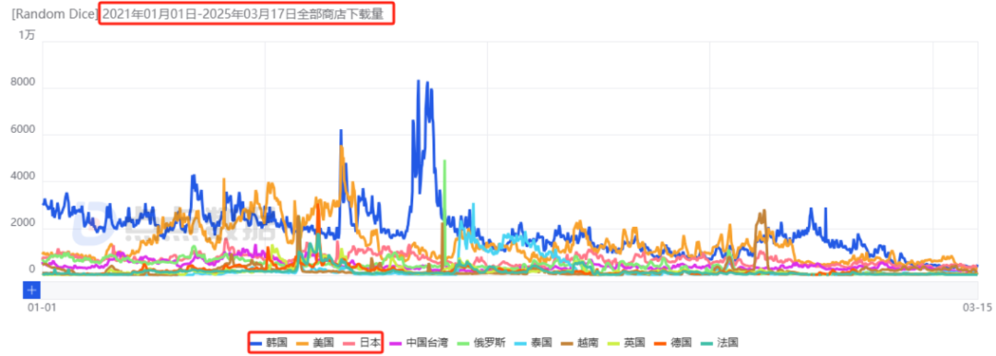下载量方面,2月25日双端都上架之后,日均下载量在2500至5000之间浮动,目前累计下载量为7.3万,韩国、中国台湾、泰国以49.07%、18.2%、7.11%的占比位列前三。