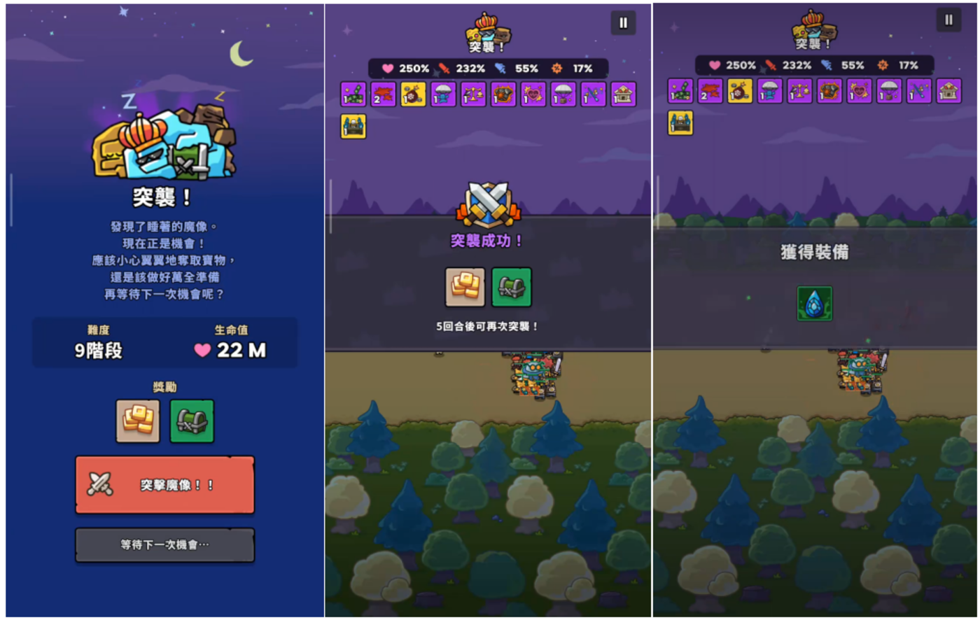 当玩家走完一圈地图后可恢复30%的生命值,地图上增加2个随机祝福格,同时自动升级至下一层地图,直到击败30层的“魔王”。局外养成方面有两条线,分别是装备强化与宠物系统。