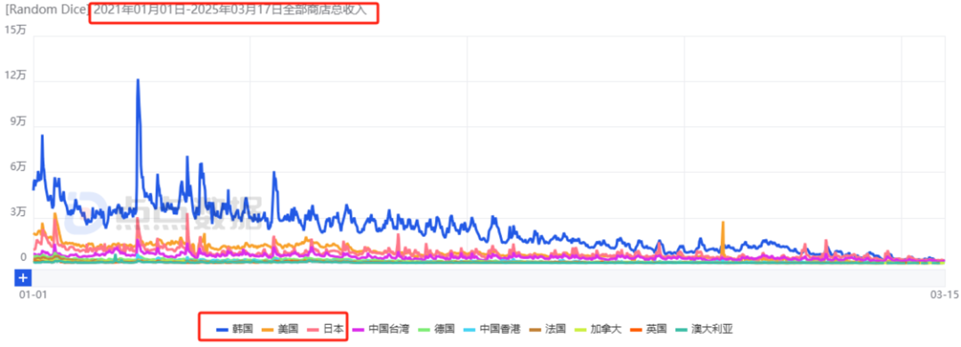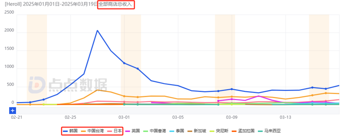 收入方面,在双端上架后的第3天(2月27日)达到2万的日流水峰值,之后开始缓速下滑,目前日流在1万元下波动。测试至今总流水预估20万左右,韩国以55.45%的贡献位列TOP1,中国台湾与日本紧随其后。