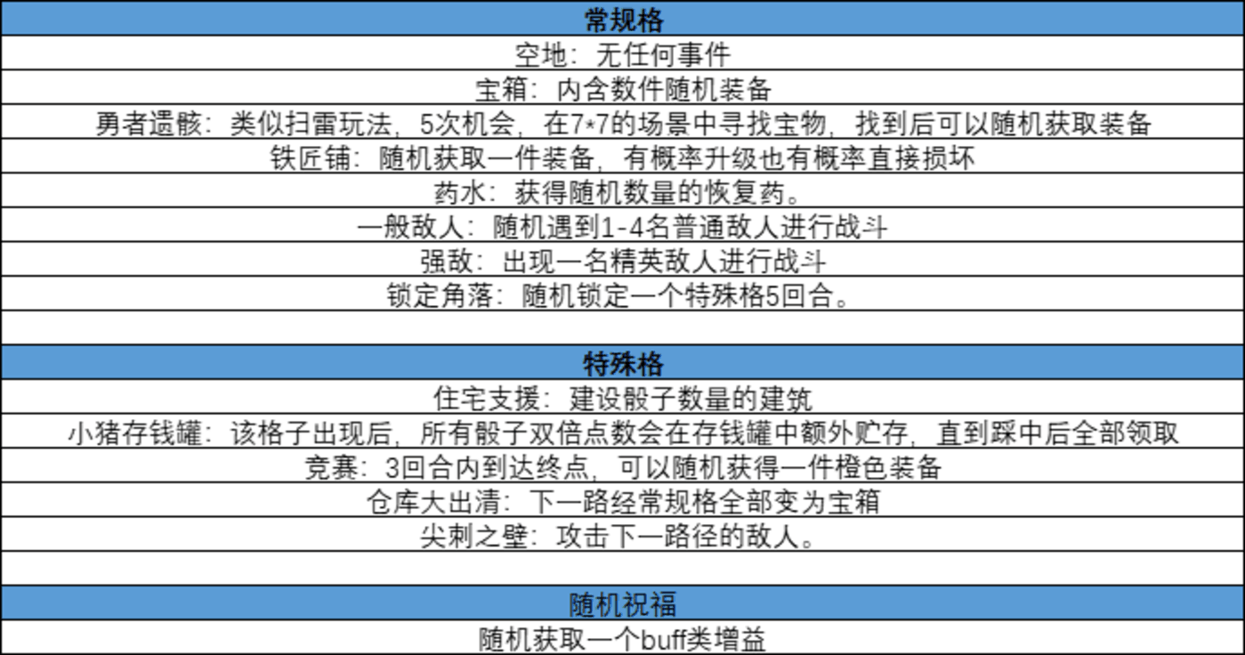 局内,游戏在一个10X10格子组成的正方形地图的四边上展开,地图上的格子可以分为四类分别是出生格&重点格、常规格子、特殊格子与随机祝福格子,它们分别对应不同的随机事件,而玩家会通过扔骰子移动至对应的格子从而触发不同的事件,完成局内角色能力的提升。