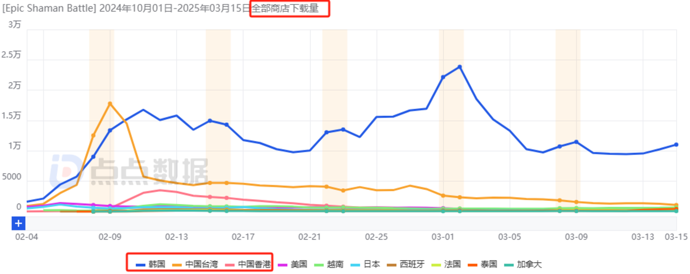 《Epic Shaman Battle》最早于2024年11月初上架Google Play,但一直未产生任何数据,今年2月初其上架App Store,2月4日上线韩国、中国台湾、美国等少数市场才开始可被统计的数据,之后其陆续登陆了全球170多个国家及地区。