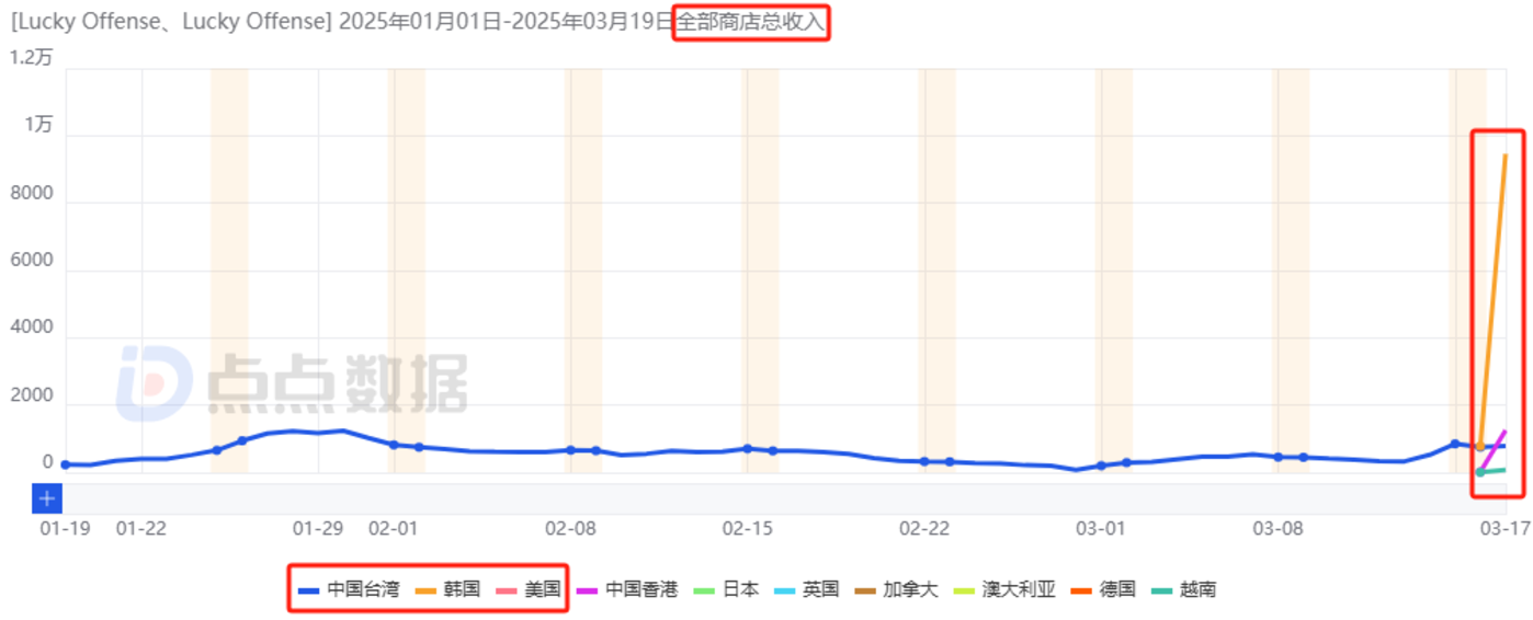 点点数据显示,单独在台湾测试期间,游戏日下载在200至800之间,日流水在1万以下动态波动,3月16日登陆全球当天,其日下载达1.3万,但日流水增加不多刚过1.1万,好在次日(3月17日)数据开始有一定冲高,日下载为2.9万,日流水为12万。